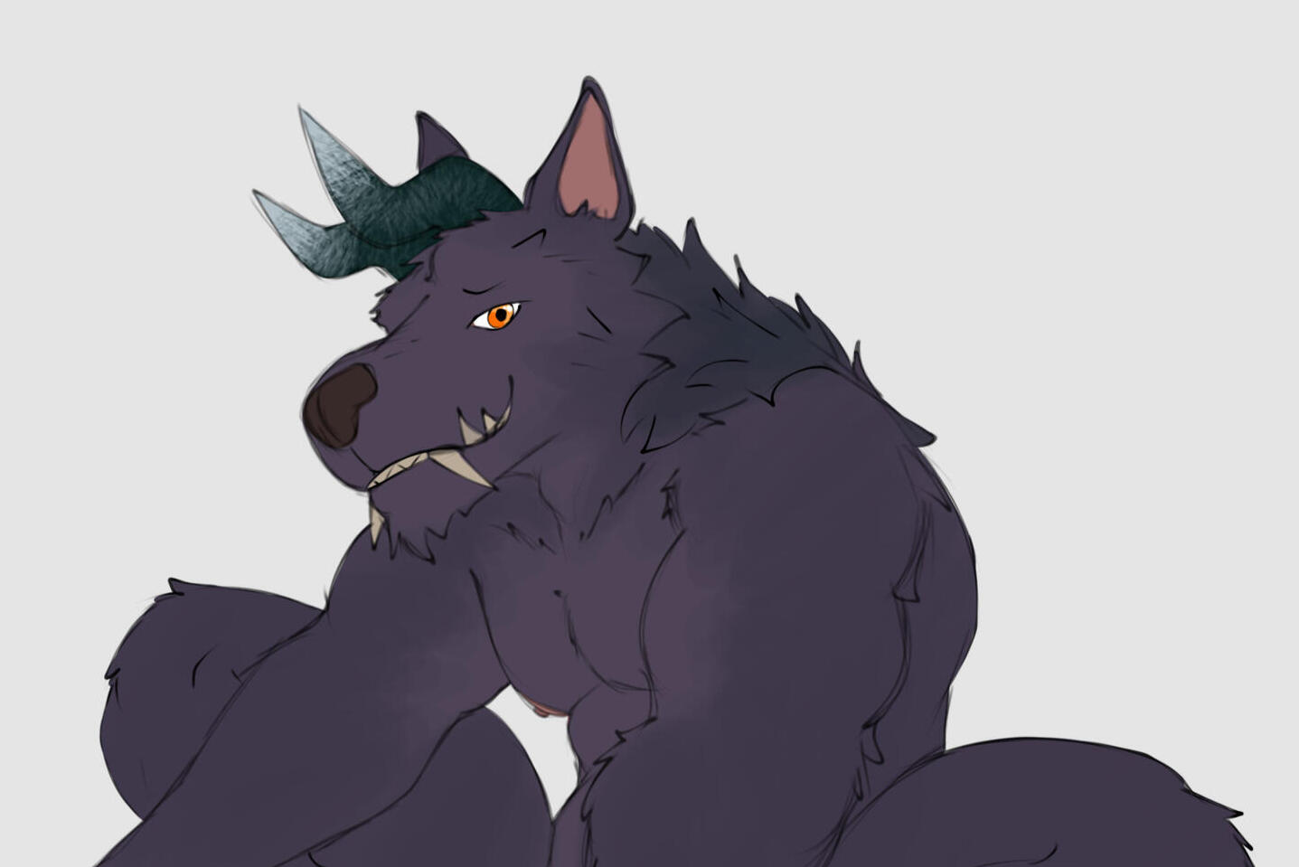 His fur is of a slightly purple hue, but mostly keeps his scales' dark nature. His belly is only slightly lighter than that. His hair is a mess, but nonetheless looks soft. He keeps his horns all the same.