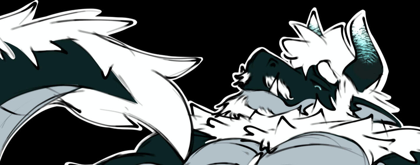 Dragonkin FormA tall, decently built but clearly lazy slug of a dragon. His scales are a dark blue tone, belly nearly white, his horns cracking with blue hues by the tip. His head, chest and tail is quite fluffy, covered in white hair.